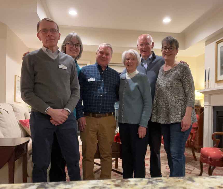 Gather Around the Table at the Stones on February 7, 2026. Pictured from left to right: Ralph and Brenda Worth, Gerry deSimas, George Stone, Jim and Kathy Boratko, and Dottie Stone, with Jennifer deSimas behind camera.