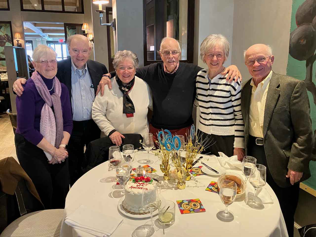 A group of friends recently celebrated their 60th wedding anniversaries and decided to commemorate the occasion together at The Artisan. Pictured from left to right are Nancy and Bob Ball, Susan and Peter Bigelow, and Dottie and George Stone.